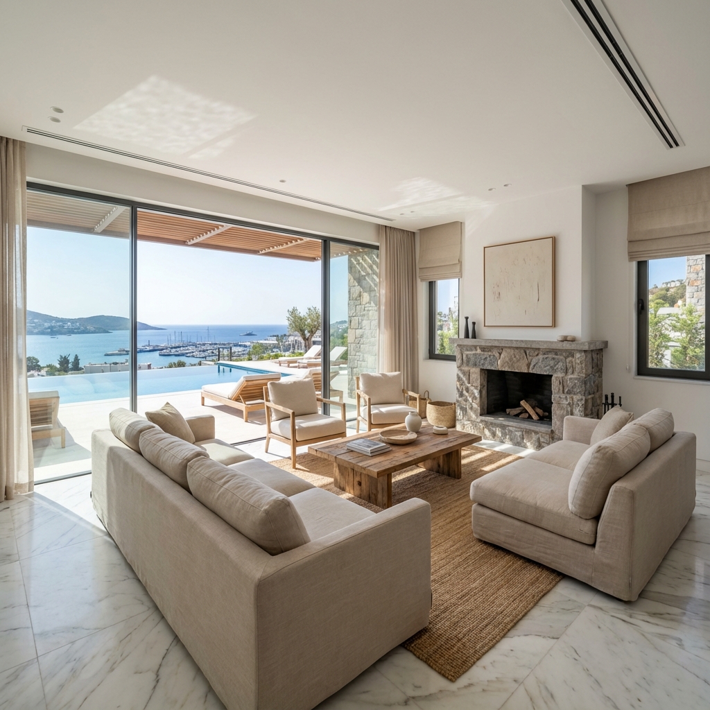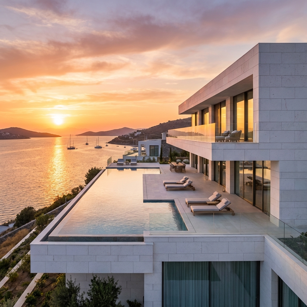 A sanctuary of privacy and luxury perched above the azure waters of Yalıkavak. The Aegean Odyssey offers uninterrupted panoramic views of the sea and the Greek Islands, redefining coastal living with unmatched architectural brilliance. Designed for the elite, this estate seamlessly blends indoor opulence with outdoor tranquility, featuring a massive infinity edge pool that appears to merge with the horizon.